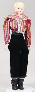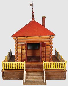 2-tlg. herrschaftl. Puppenstube, Küche, Wohnzimmer, 51 cm breit, 44 cm hoch, 44 cm tief, fest eingebaute Regale, Orig.-Bemalung an Wand und Boden, Herd aus der Zeit, Weißblech, Messingstange, eingebautes Wasserschiff, Kessel, Töpfe mit Messingdeckeln, einige frühe handgehämmerte Messingteile, Kaffeeröster, früher Weißblechteile, gedrehte Zinnteile, Holz und Keramik, Wohnzimmer mit herrschaftl. Möbeln, fein geschnitzt mit eingelegten Intarsien, Rock & Graner Blumentisch, Stubentisch, 4 Puppenstuben-Kinder, aufwendige Bodenbemalung, hochwertige alte Wandtapete, eines der schönsten Stücke aus dem Museum