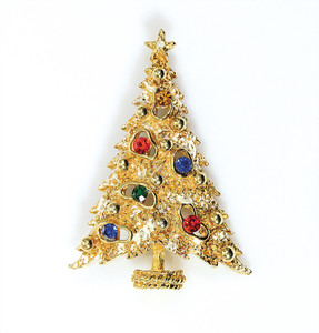 Weihnachtsbaum-Brosche, goldfarben, signiert JJ (= Jonette Jewelry, USA); unterschiedlich farbige Strasssteine. H = 55,5 mm