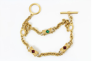 Lange Gliederkette von Grosse, Pforzheim (signiert Grossé) mit 6 beidseitig besetzten, ovalen Zwischenteilen mit farbigen Glascabochons und winzigen, klaren Strasssteinen. L = ca. 83 cm
