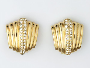 Ohrclips von CHRISTIAN DIOR (signiert), vergoldetes Metall mit Strasssteinen, Guillochenuntergrunddruck, D = 37,5 mm