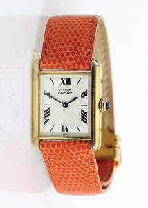 Damenarmbanduhr, CARTIER "Tank", Silber 925/000, vergoldet 20 mg, gebläute Zeiger, röm Zahlen, Schmuckkrone, original Lederband (Eidechse), original Faltschließe und schwarzem Ersatzband, kleiner Abplatzer am Glas links oben, Uhr läuft
