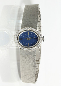 Damenarmbanduhr, ONSA, WG 585/000, 30 Brillanten ca 0,9 ct tw/w-vsi, dkl. Blaues Ziffernblatt, Strichindex, Handaufzug (Schweizer Werk mit 19 Rubinen), L = 19 cm (mit Leiter bis auf 18 cm kürzbar, total 40,3 g, Uhr läuft