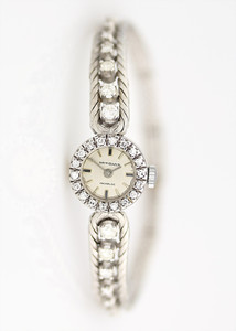 Damenarmbanduhr, WG 750/000, Handaufzug, Strichindex, 32 Brillanten/Diamanten,ca.0,50 ct weiß-si, L = 18,2 cm, Uhr läuft, total 22,8 g