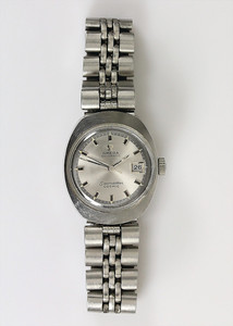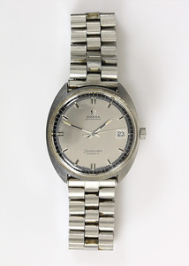 Herrenarmbanduhr, OMEGA, SEAMASTER-COSMIC, 166026-TOOL 107, Edelstahlgehäuse, Stahlarmband mit Faltschließe, Ziffernblatt mit Strichindex, Zentralsekunde, Datum, Automatik Kal. 565, Kunststoffglas, (Werk wird von vorne eingesetzt), L = 20 cm, (Welle defekt), Uhr läuft