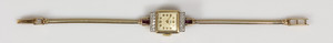 Damenarmband-Uhr, ART-DECO um 1930, Handaufzug, GG 375/000, 24 Diamanten, ca 0,25 ct weiß, 4 Rubin-Carrees, L = 16,5 cm, Uhr läuft