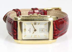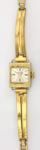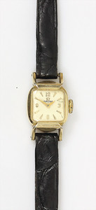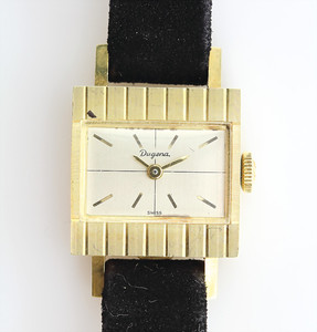 Damenarmbanduhr, DUGENA , 50/60er Jahre, GG 750/000, Strichindex, Gehäuse ca. 17 x 17 mm, Handaufzug, Kal. 383, orig. Lederband mit Samtoberfläche u. Dornschließe, Uhr läuft