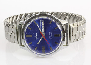 Herrenarmbanduhr 50er Jahre, GLADIUS, blau leuchtendes Zifferblatt, Strichindex, Zentralsekunde, Tag / Wochendatum, Automatik, Kal: FB 226, D = 35 mm, Uhr läuft