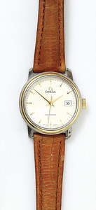 Herrenarmbanduhr OMEGA DeVille, 20 Mic. vergoldet, röm. Zahlen / Strichindex, Datumsfenster, gedrückter Boden (Stahl), Quarzwerk, Lederband mit Dornschließe, D = 32,5 mm, Uhr läuft