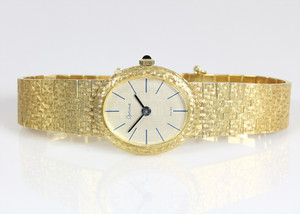 Damenarmbanduhr 70er Jahre, OPTIMA Swiss Made, GG 750/000, gebläute Zeiger, Strichindex, ovales Gehäuse mit Goldband, Schmuckkrone, Sicherheitskettchen, Handaufzug, 17 Rubine, sehr guter Zustand, L = 18 cm, total 43,1 g, Uhr läuft