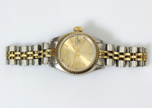 Damenarmbanduhr 70/80er Jahre, ROLEX OYSRER PERPEDUAL DATE Lady, Stahl/ Gold, , goldfarbenes Ziffernblatt, Zentralsekunde, Datum hinter Lupenglas, verschraubte und sig. Krone, Kunststoffglas, verschraubter Boden, Metallband, Faltschließe, Automatikwerk, D = 26 mm, L = 18 cm, (sollte überholt werden), Uhr läuft