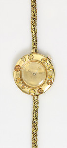 Damenarmbanduhr, EXKLUSIVE ANFERTIGUNG, GG 750/000, 11 cognac farbene Brillanten ca. 2,05 ct si, goldfarbene Zeiger, Krone auf 2 Uhr 30, Handaufzug, SARCAR GENEVE, 17 Rubine, Band: gedrehte Fuchsschwanzkette mit Kastenschloß und Sicherheitsacht, L = 18 cm, total 34,7 g, Uhr läuft