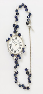 Damen-Schmuck-Uhr aus den 70er Jahren, CHOPARD, weißes Ziffernblatt mit röm. Index, WG 750/000, bl. Schmuckstein in Krone, Handaufzug, 14 Brillanten ca. 1,5 ct tw-vvsi/lupenrein, 42 Saphire feine Qualität, kl. Kastenschloß mit Schnepper und Sicherung, Sicherheitskettchen, L = ca. 18 cm