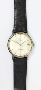 Herrenarmbanduhr 60/70 Jahre, OMEGA Seamaster, Strichindex, Zentralsekunde, Datum, Kunstoffglas, Handaufzug, orig. Kalbs-Lederband mit Dornschließe, D = 34 mm, Uhr läuft
