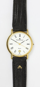 Herrenarmbanduhr 60/70 Jahre, MAURICE LACROIX, Mod.92127, Strichindex, Zentralsekunde, Datum, Krone mit Schmuckstein, Quarz, orig. Lederband mit Dornschließe, D = 34,5 mm, Uhr läuft