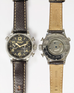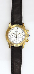 Herren-Chronograph, DUBOIS, Edition Homage Elias Joseph 1795, Nr: 496/999 Edelstahl/Gold, röm Index, Schmuckstein in Krone, Handaufzug, ged. Boden, Kal: Lemania 1873, D = 38 mm, Lederband, Uhr läuft (Aufzugsfeder defekt)