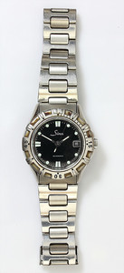 Herren-Uhr aus den 90er Jahren, SINN, Edelstahl, schwarzes Z.Blatt, Zentralsekunde, Strich & Punktindex (Leuchtindex), Automatik (kein Sekundenstopp), ged. Boden, Kal: Lemania 2824, D = 38 mm, Uhr läuft (Aufzugsfeder/Krone defekt)
