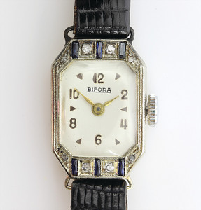 Damenarmbanduhr BIFORA, ART-DECO 20/30er Jahre, GG/WG 750/000, 4 Diamanten, 4 Diamantrosen, 6 Saphire, röm.Zahlen/Strichindex, Lederband mit Dornschließe, L = 20 cm, Uhr läuft
