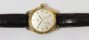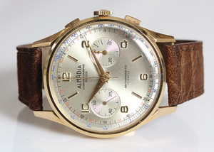 Herrenarmbanduhr 40/50er Jahre, ALMADIA Chronograph Swiss, ROSEGOLD 750/000, arab. Zahlen / Strichindex, Kunststoffglas, kl. Sek. Auf 9 Uhr, gedrückter Boden, Krone ersetzt (Omega), Handaufzug, Kal: Landeron 248 (ohne Stoßsicherung), Lederband (Omega) mit Dornschließe, D = 37,5 mm, Uhr läuft