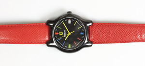 Damenarmbanduhr, TISSOT um 1995, "CERAMIKGEHÄUSE", schwarzes Zifferblatt, farbige arab. u. röm. Index, Datum auf 3 Uhr, Quarzwerk, Lederband mit Dornschließe, D = 35,5 mm, neuwertiger Zustand, braucht neue Batterie