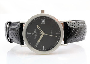 Herrenarmbanduhr Anfang 90er Jahre, CHARLES FABIEN Paris, Strichindex, Datumsfenster, Vierkantkrone, Gehäuse Palladium beschichtet, Automatik, GLASHÜTTE / SA, Kal: ETA 2824-2, 17 Rubiene, schwarzes Kunstoffband mit Dornschließe, D = 34 mm, H = 9,3 mm, ( Glas mit Kratzer), Uhr läuft