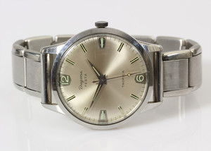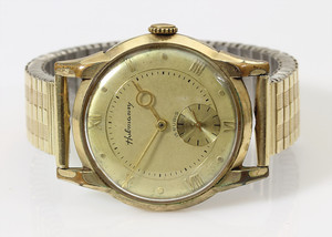 Herrenarmbanduhr 40/50er Jahre, DUGENA FESTA TROPICA, Zentralsek, arab. Zahlen u. Strichindex, Handaufzug, Kal: L.48 ohne Stoßsicherung, D = 34,5 mm Metallband, Uhr läuft