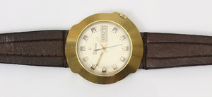 Herrenarmbanduhr, BULOVA - ACCUTRON 1974-1970, Goldplattiert, Zentralsek., Tag- Datumfenster, Stahlboden verschraubt, Accutron-Quarzwerk, Kal. 2182, original Lederarmband mit Faltschließe, Uhr läuft