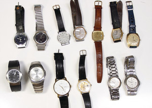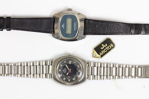 Lot: Herren-Armbanduhren: ARCTOS, 1 x "Erste" in Deutschland hergestellte Quarzuhr !!, 70er Jahre, Fa.PHILIPH WEBER Pforzheim, blau / schwarzes Ziffernblatt, Block u. Strichindex, rote Zentralsekunde, Datumsfenster, Index, Std- u. Min. Zeiger mit Leuchtmasse, Kunststoffglas, Boden gedrückt mit Batteriefach, Stahlband, Uhr läuft !! Originalschatulle mit Etiketten; 1 x Arctos 70er Jahre, "Digital-Quarz" Uhr, Stahlgehäuse, gedrückter Boden, Mineralglas, Lederband u. Dornschließe, Batteriekomponente fehlt !