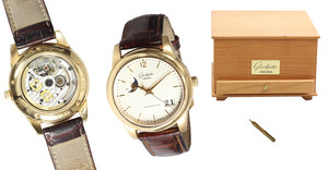 Herren-Armbanduhr, GLASHÜTTE ORIGINAL, "SENATOR PANORAMA", Nr.0135 von 3385, Ref. Nr.39-41-01-01-04 um das Jahr 2000, 750/000 "ROSE" Goldgehäuse, ungewöhnliche Anordnung des Datums und der Mondphase, Automatik Kal., 39-41, Sicht und Boden aus Saphirglas, Datumsanzeige (schnellschaltbar), Zentralsekunde, kratzfestes Saphirglas, Feinregulierung-Schwanenhals, Rotorschwungmasse aus 21 kt Gold, D = 38,6 mm, Höhe 10,6 mm, Lederband mit Dornschließe, in Original Holzschatulle mit Papieren, wenig getragen !! Gepflegter Zustand. Uhr läuft