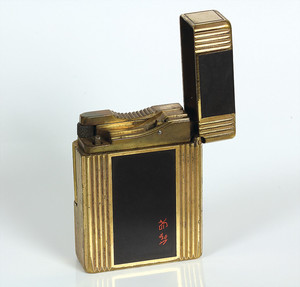 Gasfeuerzeug, DUPOND, vergoldet, schwarz emailliert mit rot abgesetzten chinesischen Schriftzeichen, H = 47 mm, Gebrauchsspuren (Kanten abgenutzt)