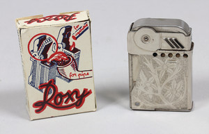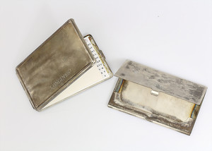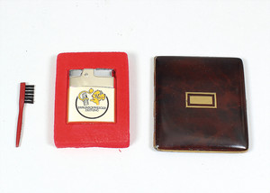Benzinfeuerzeug und kleines Zigarettenetui, 50er Jahre, Werbung: BRAUNSCHWEIGER ZEITUNG, Feuerzeug H = 50 mm mit Originalkarton, Etui 81,5 x 73,5 x 11 mm