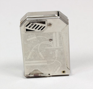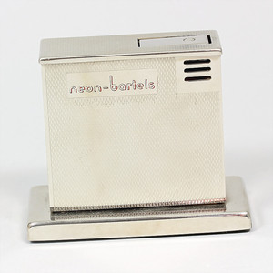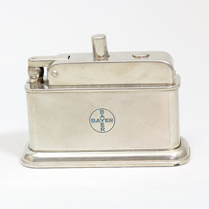 Benzinfeuerzeug, 30er Jahre, Feuerzeug mit seltener Technik ! 1 Knopf zum Zünden, 1 Knopf zum Schließen, BAYER Werbung, H = 80 mm