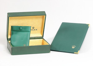 Lot: ROLEX Acessoires, 1 x Holzschatulle mit grünem Leder überzogen (oben Druckstellen); 1 x Leder Mappe für Ausweis / Visitenkarten 11,5 x 14,5 cm; 1 x kl. Kunstoffmäppchen 6,8 x 8 cm
