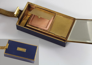 Feine hochwertige Abendtasche für die Dame !, 30er Jahre, PARK LANE LSM (PAT.APP.1858/37), beide Seiten mittels Klappbügel zu Öffnen, 1 Seite mit Puder, Rouge, Lippenstift (fehlt) und Spiegel, andere Seite mit Halterung für kl. Zigaretten, Streichhölzer u.Visitenkarten, Gehäuse mit dkl.blauen Emaillelack und vergoldeten Rahmen, feines Flechtband als Griff, 11 x 6,2 x 2,4 cm (ohne Schlaufe), schöner Zustand !