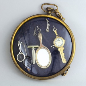 Collage, hinter gewölbten Glas arrangierte Friseurutensilien, Messingrahmen D = 12,8 cm, kann an einer Kette aufgehängt werden