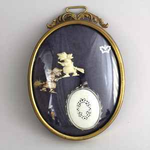 Collage, hinter gewölbten Glas arrangierte Hexen, ein Perlmuttanhänger sowie kl. Schmetterling, ovaler Messingrahmen, H = 16 cm