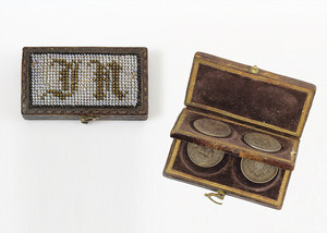 Kleine Schatulle, 2 x aufzuklappen, für 4 Münzen, geprägtes Leder mit Perlstickerei, opalisierende Glas- und Metallperlen, Monogramm "D M", innen mit Samt ausgeschlagen, zwei 1/2 Mark dt. Kaiserreich, 1905/06 innenliegend, Messingbeschlag, Maße ca 65,0 x 36,o x 18,5 mm