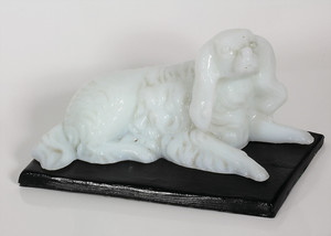Hund, ENGLAND Ende 19.Jhd., Hund aus Milchglas auf dkl. Holzunterlage, Unterseite mit marmoriertem Papier bezogen, H = 6,5 cm, Sockel 12 x 7 cm