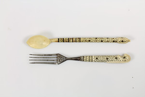 Reisebesteck 1.Hälfte 19.Jhd., Löffel aus Bein mit Metalleinlagen, Gabelgriff aus Bein, vorderer Teil mit Silbertauschierung, L = 17 cm