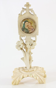 Wallfahrtsdevotion, farbig bemaltes Marienbild hinter Glas, Bein, floral beschnitzt, als Abschluß kl. Kreuz