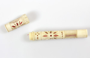 Nadelbehältnis Ende 19.Jhd., Bein, feine aufwendige Gravur, innen mit Stoff ausgeschlagen, D = 11,8 mm, L = 9 cm