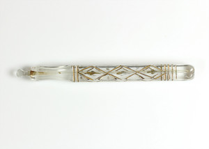 Flacon um 1900 wohl ENGLAND, Kristallglas geschliffen mit Goldeinlage, Originalstöpsel, L = 13,5 cm (ohne Stöpsel)