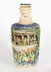 Riechfläschchen, "SNUFF BOUTTLE", Ende 19. Jhd., ELFENBEIN wohl China, sehr aufwendig und fein geschnitzte höfische Figurenszene, Zuschauer schauen sich von einer Empore eine Darbietung an, original Bemalung, Stöpselabschluß mit Silberplatte verziert, H = 10,8 cm