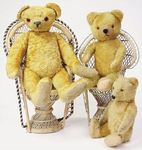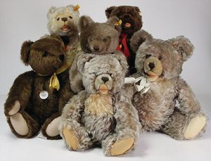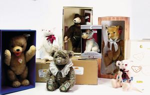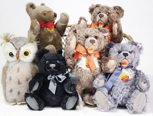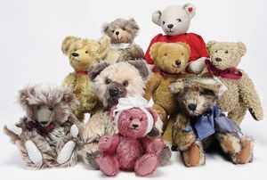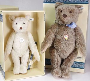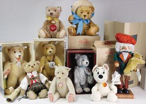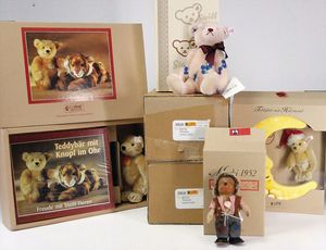 Konv. Steiff Replika, im Orig.-Kart., 1 x Cherished Teddys, Daisy, blond, 33, im Orig.-Kart., 1 x Teddybär, Junge, blond, 29 cm, limitierte Auflage von 500 Stück weltweit, mit Zertifikat, im Orig.-Kart., 1 x Christian Uhlbricht GmbH & Co, handmade in Germany, Nussknacker, im Orig.-Kart., Schlappbigi?, 1936/96, im Orig.-Kart., 1 x Teddybaby, 1929, blau, 28, im Orig.-Kart., 1 x Steiff Replika, Musiktedd, 1951, caramel, 35, 1 x Steiff Replika, beige, 28, im Orig.-Kart., dazu 1 Babybär, 1946, blond, 35, im Orig.-Kart., 1 x Dicky, 1930 weiß, 33, bitte besichtigen