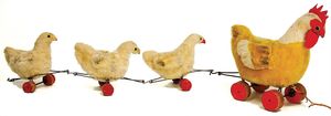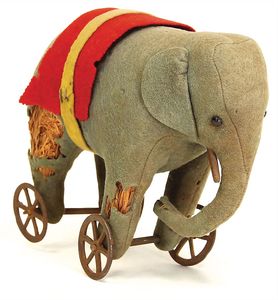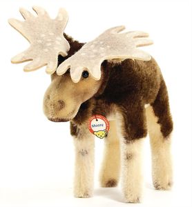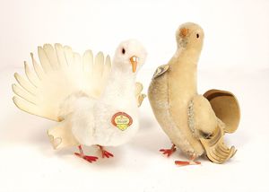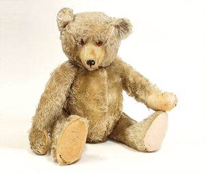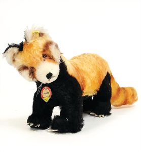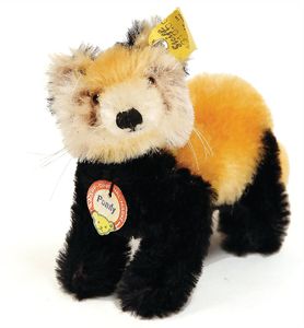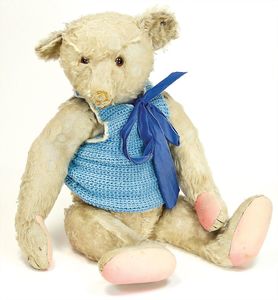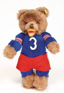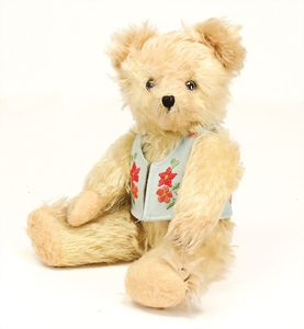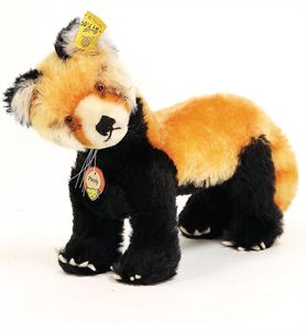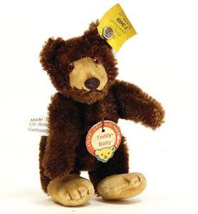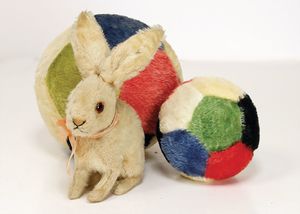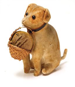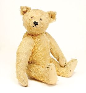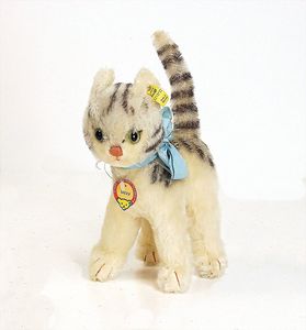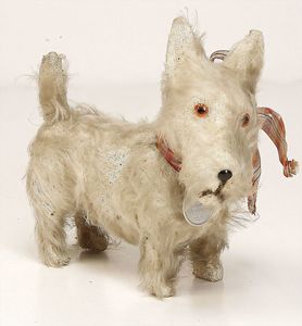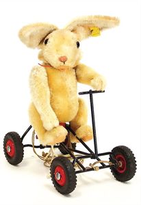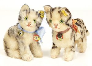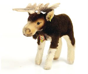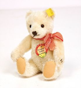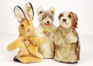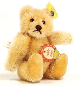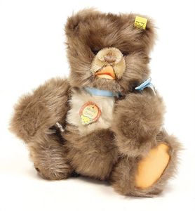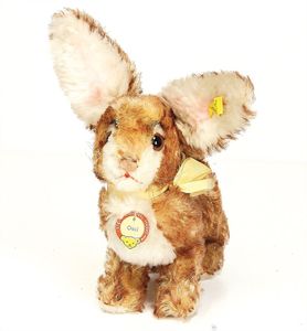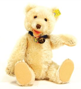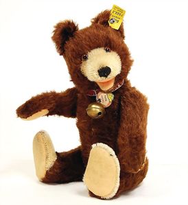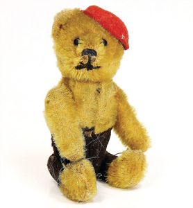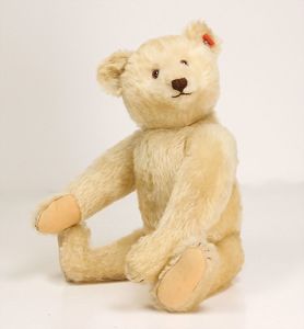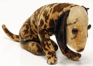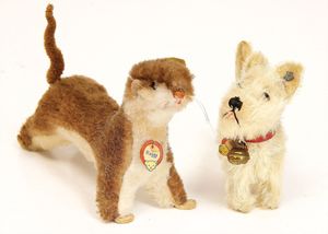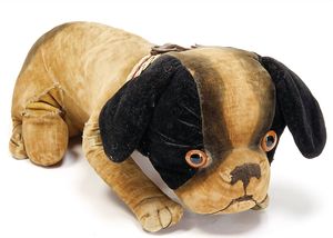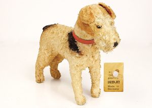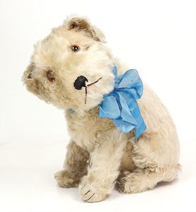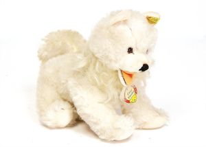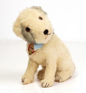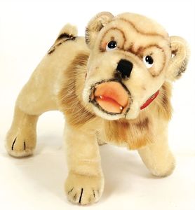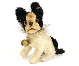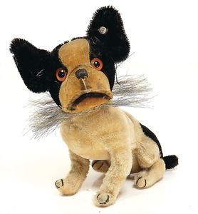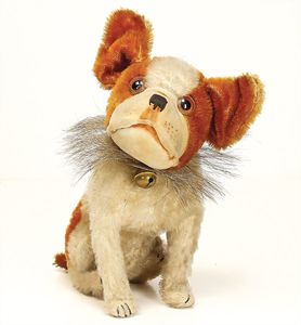 engl. Bulldogge, kompl. mit Knopf, Schild u. gelbe Fahne, Nr. 1318,0, Orig. rotes Lederhalsband, mit Haarkranz, Brustschild mit Aufschrift: „Bully“, drehbarer Kopf, mit schwarz/weißen Googly-Glasaugen, off. Mund, 2 Zähne, unbespieltes beigefarbenes Mohair, dieser seltene Artikel wurde von der Firma Steiff Mitte der 50er Jahre lediglich in geringer Stückzahl für den amerikanischen Markt produziert, Stehhöhe: 17 cm, L: 22 cm, ausgefallen