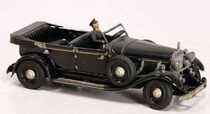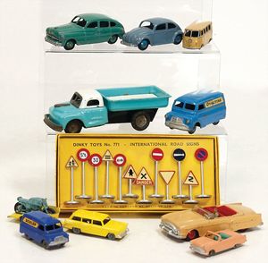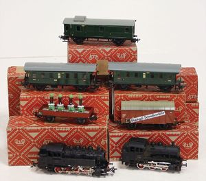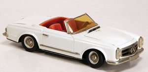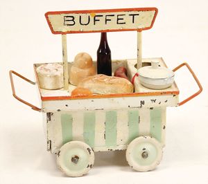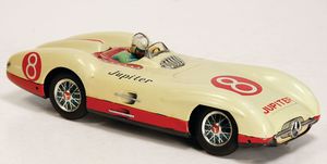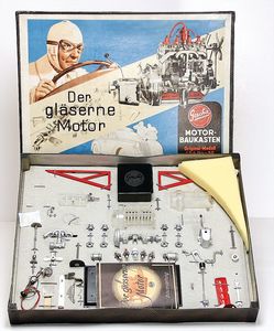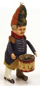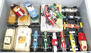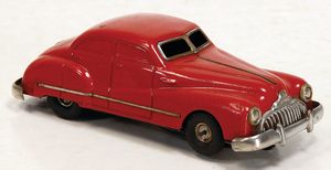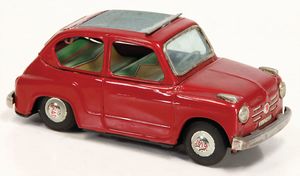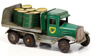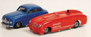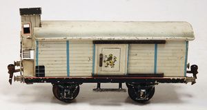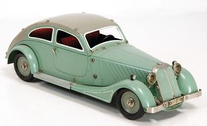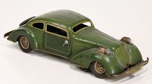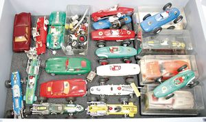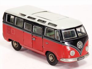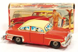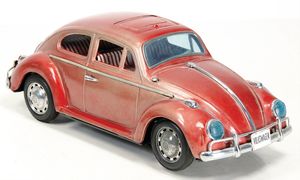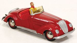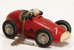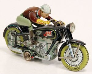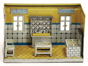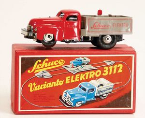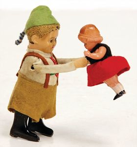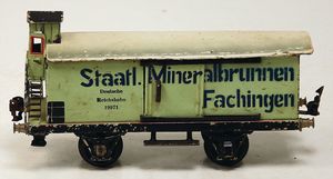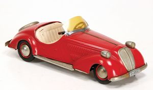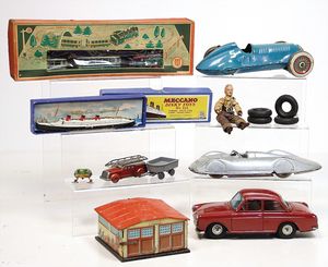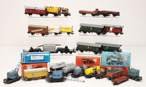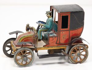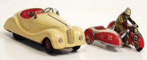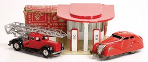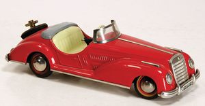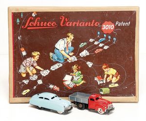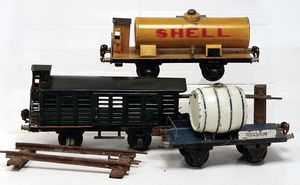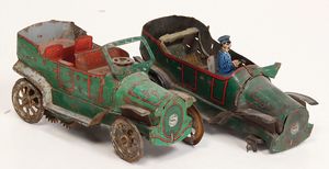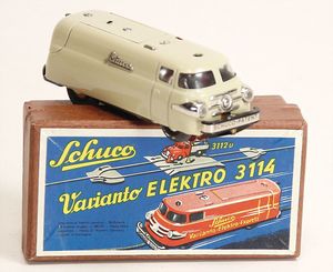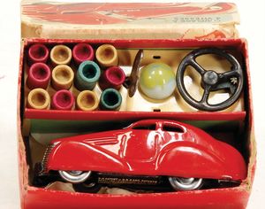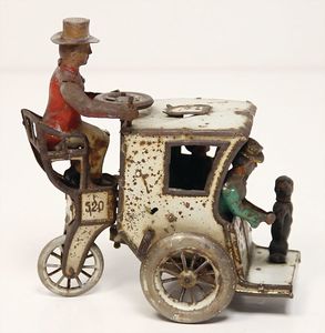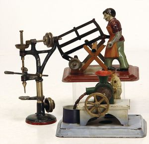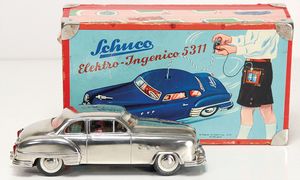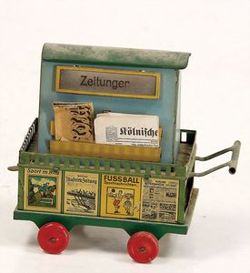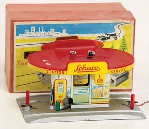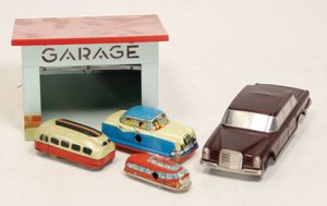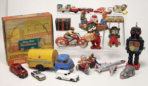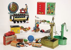 Fundkiste, Blechspielzeug, darunter Schuco, Fernlenkauto, Uhrwerk intakt, Verbindungskabel fehlt, im Orig.-Kart, 2 Brunnen, Höhe 17 u. 18 ,5 cm, altersbedingte Farbabplatzer, 3 Blech-Spardosen, 1 Dampfmaschinen-Antriebsmodell, Mann an Kreissäge, einige Köhler Figuren, Uhrwerke intakt, 1 Schuco Maus, kl. Blechgarage mit 2 Blechautos, Garagelänge 6,5 cm, u.a.