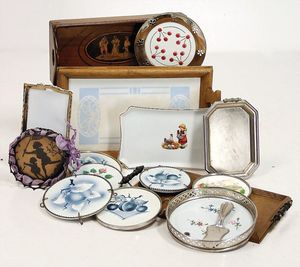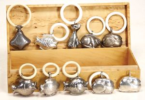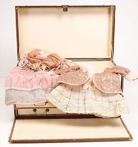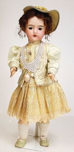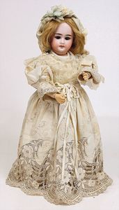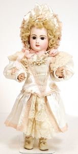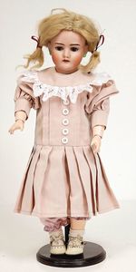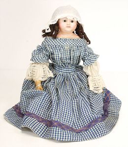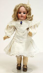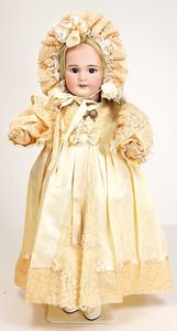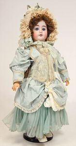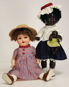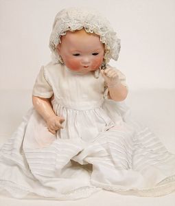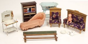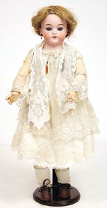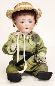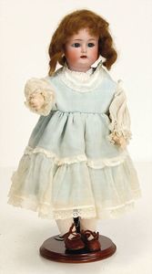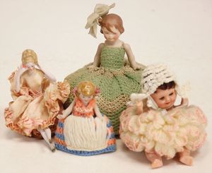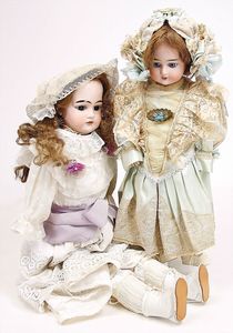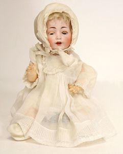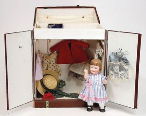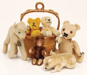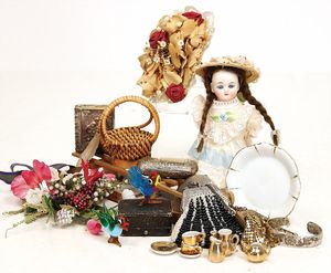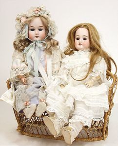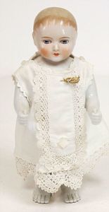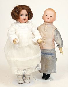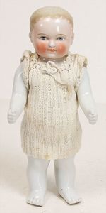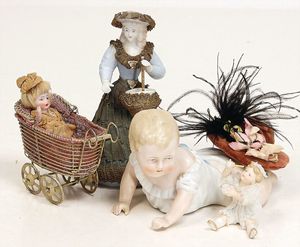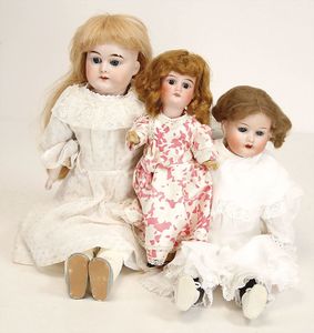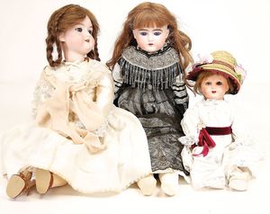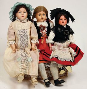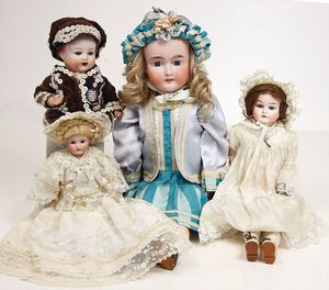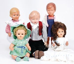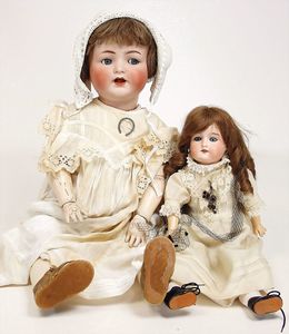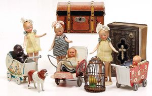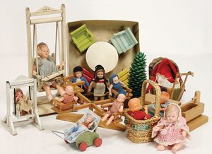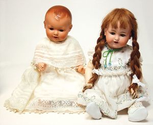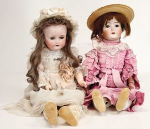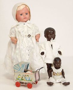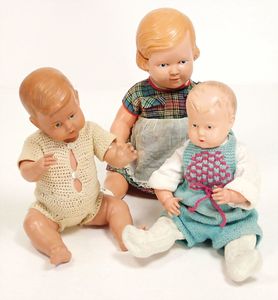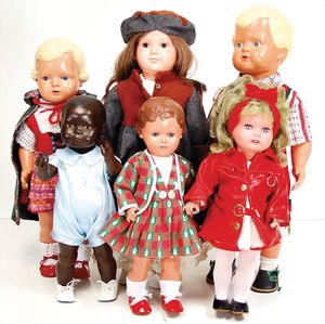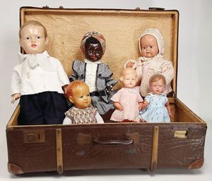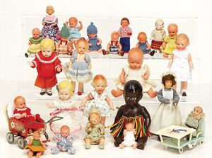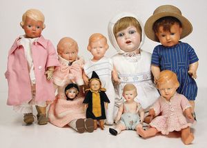 schönes Konv. Celluloid-Puppen, meist Schildkröt, darunter Inge, gemarkt 34, auf altem Masse-Toddlerkörper, bespielt, 1 Finger weggebrochen, 36 cm, Brustblattkopf-Puppe, gemarkt 11, auf Stoffkörper, Celluloid-Arme, 42 cm, 3x Cellba, fester Kopf, gemarkt 19 1/2, 2x 29, 1x König u. Wernicke für Schildkröt, gemarkt 298/5, Kopf Miblu, blaue Schlafaugen, off. Mund, Zähne, Riss am linken Auge, auf Masse-Stehbabykörper, 33 cm, 1x Kämmer u. Reinhard, gemarkt 728/8, blaue fest eingesetzte Glasaugen, off. Mund, Zähne, Echthaarperücke, Celluloid-Sitzbabykörper, mit leicht abstehendem Zeh, 45 cm