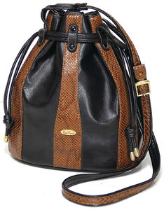 Beuteltasche, Rindsleder, schwarz, mit cognacfarbenem Leder in Reptilien-Optik, goldfarbene Plakette mittig auf Frontseite, langer Schultertrageriemen, Innenfutter aus schwarzem Kalbsleder, H: 30 cm, B: 26 cm, guter Zust.