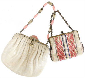 Konv. 2 Damenhandtaschen, ca. 1920/1930, mit reichh. beigefarbenen Perlen bestickt, Kettentrageriemen mit rosafarbenen Steinen, dazu kl. Damentasche mit Kettentrageriemen, ausgefallen, guter Zust.