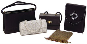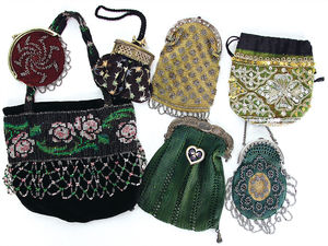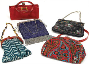 5 Damenhandtaschen, untersch. Alter, mit Perlen bestickt, sowie 1 kl. Tasche aus Leder, ausgefallen, guter Zust.