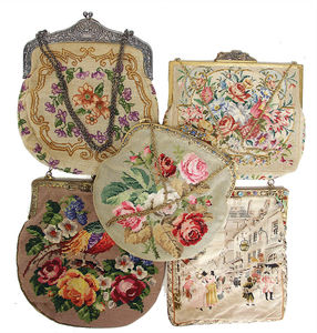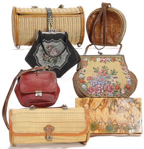 Konv. Damenhandtaschen, 7 tlg., untersch. Alter, Petit-Point Arbeit, sowie 2x holzgeflochtene Körbe, dekorativ, guter Zust.